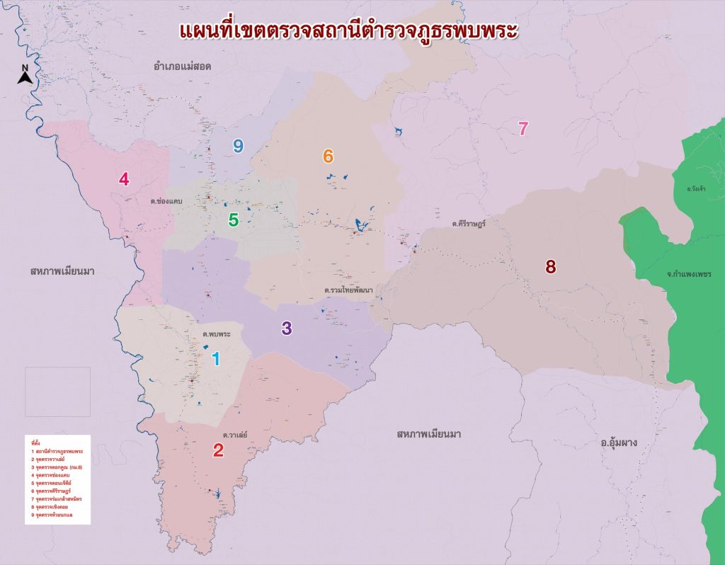 หมายเหตุ1.สถานีตำรวจภูธรพบพระ2.จุดตรวจวาเลย์3.จุดตรวจดอกคูณ (กม.8)4.จุดตรวจช่องแคบ5.จุดตรวจดอนเจดีย์6.จุดตรวจคีรีราษฎร์7.จุดตรวจร่วมเกล้าสหมิตร8.จุดตรวจเชิงดอย9.จุดตรวจห้วยนกแล